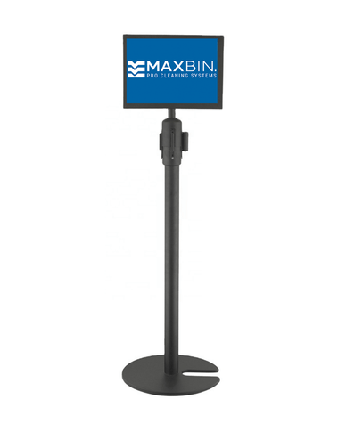Durable 1200mm black powder-coated crowd control stanchion with A4 sign frame and 2 m belt. Perfect for lobbies, hotels, and events needing elegant signage and queue management. Customizable belt colors available.