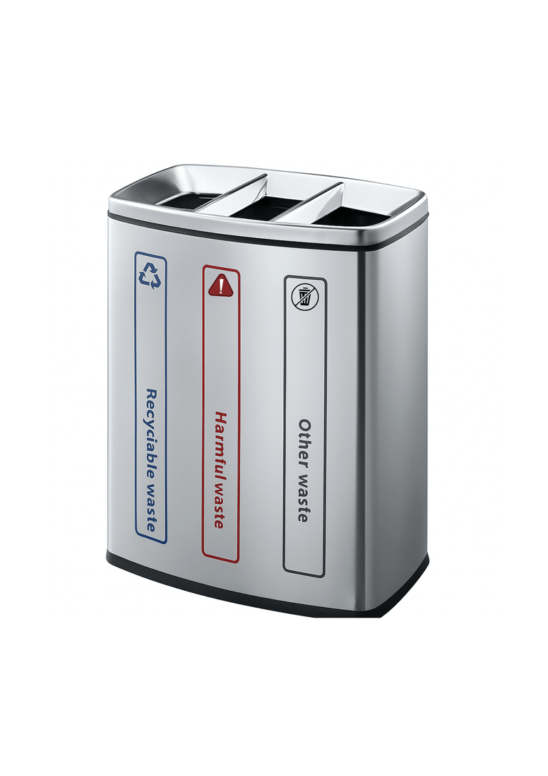 The MaxBin 189233 is a compact and stylish three-compartment waste bin designed for efficient waste sorting in public and professional spaces. Built from high-grade stainless steel with durable galvanized inner bins, this bin combines practicality and modern aesthetics. Perfect for offices, schools, lobbies, and malls where space-saving and functionality matter.