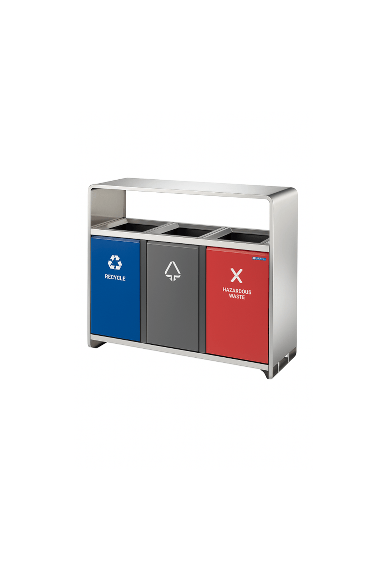 The 189239 is a high-performance, triple-compartment bin crafted from stainless steel with galvanized inner bins. Designed for efficient waste segregation, this model features three clearly labeled sections for recyclables, general waste, and other types of waste. Its clean silver finish and sturdy construction make it perfect for public spaces such as airports, offices, schools, and malls.
