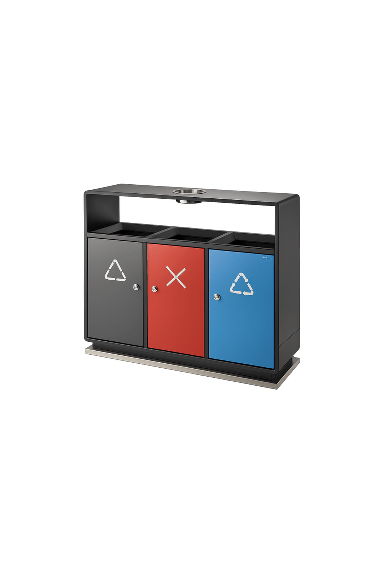 The 189240 is a robust and stylish triple-compartment bin designed for organized waste separation. Built from stainless steel with galvanized inner bins, it is perfect for public spaces such as schools, airports, malls, parks, and offices. Each compartment is clearly color-coded for different waste types, enhancing recycling efficiency and user convenience. The matte black frame and durable structure make it both functional and modern in appearance.