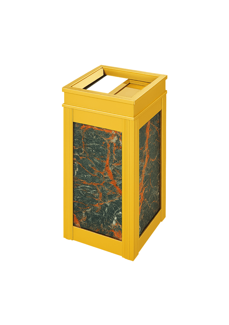 The 189101 is a luxurious indoor waste bin designed for high-end environments such as hotel lobbies, VIP lounges, executive offices, and upscale commercial areas. With a compact 11-liter capacity, it combines elegance and function through its gold frame, mirror-silver finish options, and decorative marble-style panels. The bin includes a durable steel inner liner for easy waste management and a refined look that enhances sophisticated interiors.