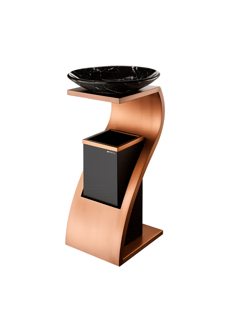 The 189131 is a premium outdoor ashtray bin designed with elegance and durability in mind. Featuring a sleek, curved silhouette with a rose gold and black finish, this unit is ideal for upscale environments such as hotel entrances, office buildings, and luxury shopping centres. Its stainless-steel body and internal steel bin ensure long-lasting performance while offering a modern aesthetic appeal.